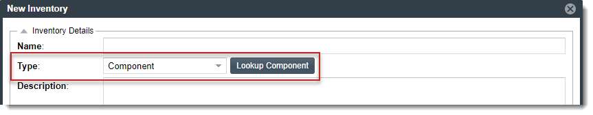 1. Follow the instructions to start the process of creating or updating an existing inventory item in the Analysis Workbench or in Project Inventory. The Lookup Component feature is available only if you are creating or editing an inventory item with a Type of Component.