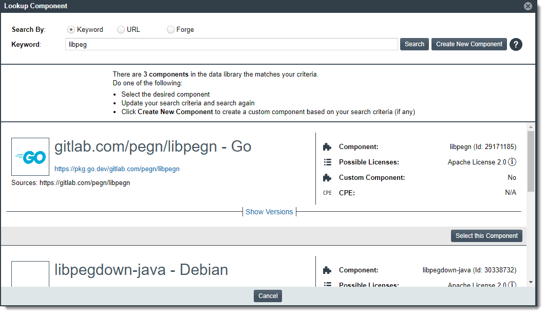 8. In the list of search results in the Lookup Component window, scroll to the appropriate component section, and click Show Versions (or Show Instances) to display the list of instances (version-and-license combinations) for that component.